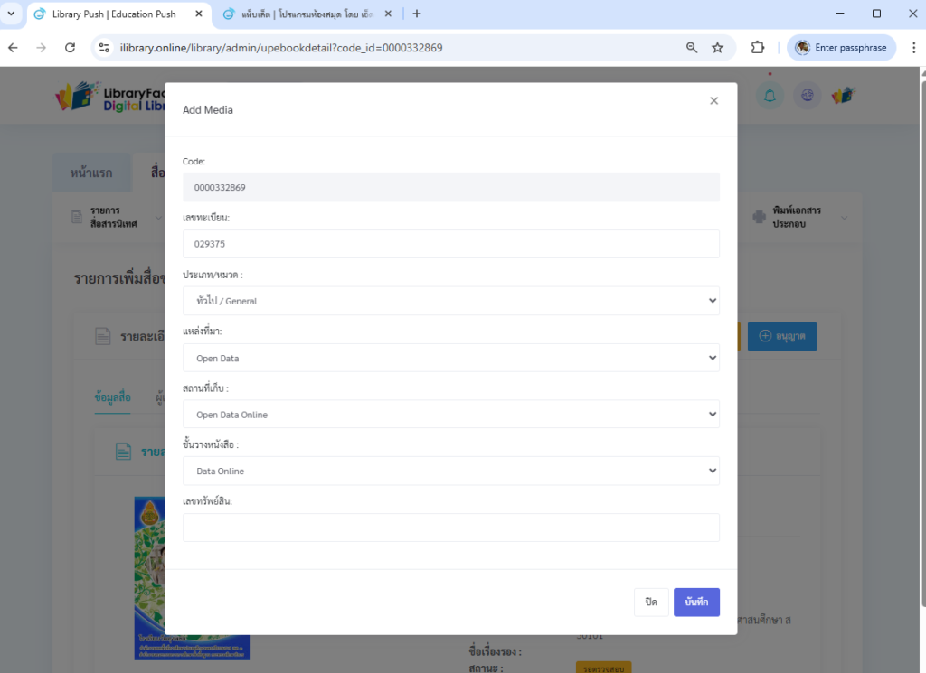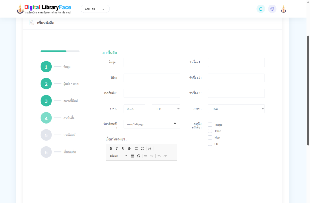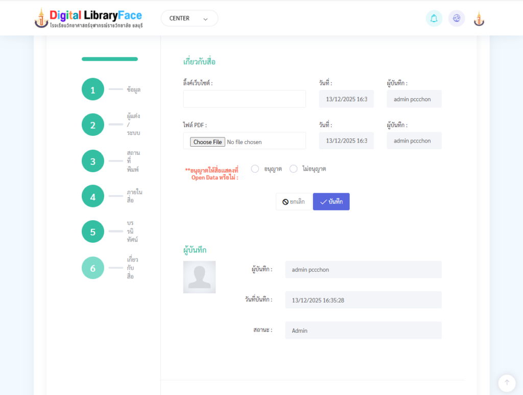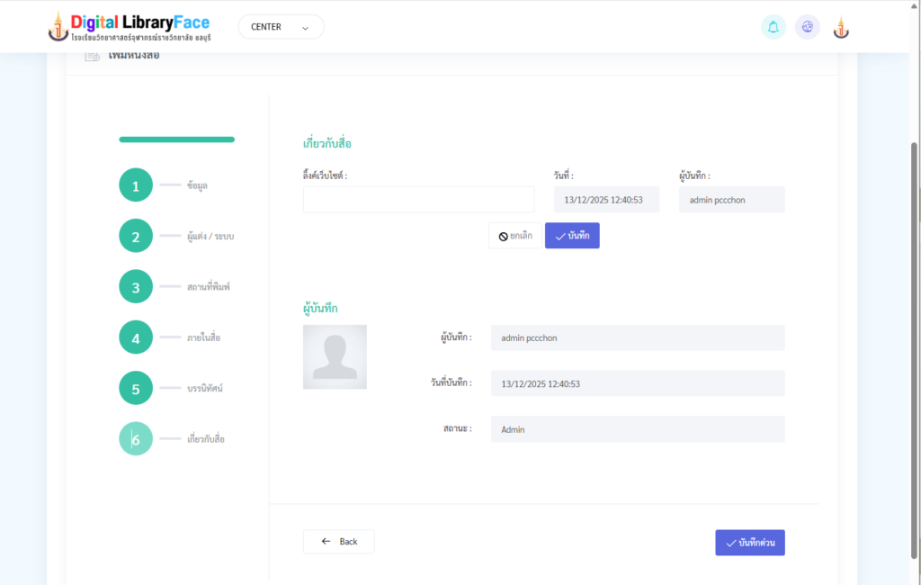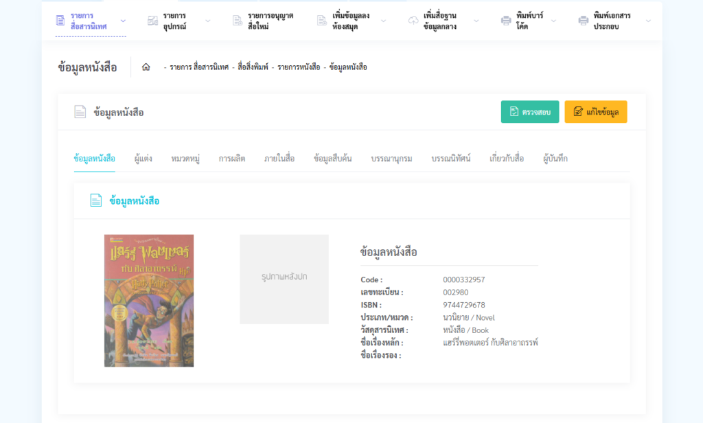 - เสร็จหมดแล้ว ให้กดปุ่ม บันทึก แล้วข้อมูลก็จะถูกเก็บบนฐานข้อมูลกลาง และก็ไปเพิ่มข้อมูลลงห้องสมุดที่เมนู เพิ่มข้อมูลลงห้องสมุด อีกที