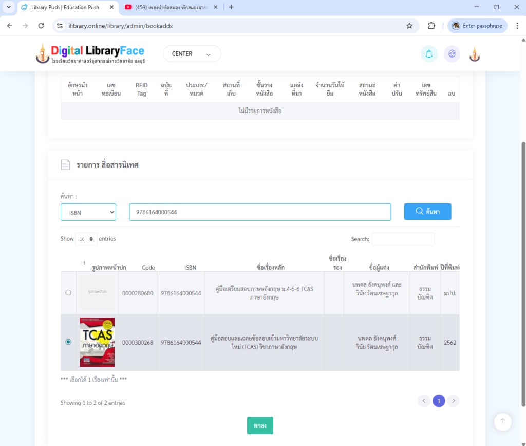 - ระบบจะโชว์ข้อมูลหนังสือที่ค้นหาอาจมีหลายเรื่อง ให้ติ๊กเรื่องได้หนึ่งเรื่อง เพื่อเป็นต้นแบบ และให้เลือกเล่มที่ตรงกับปีพิมพ์ที่จะพิมพ์
