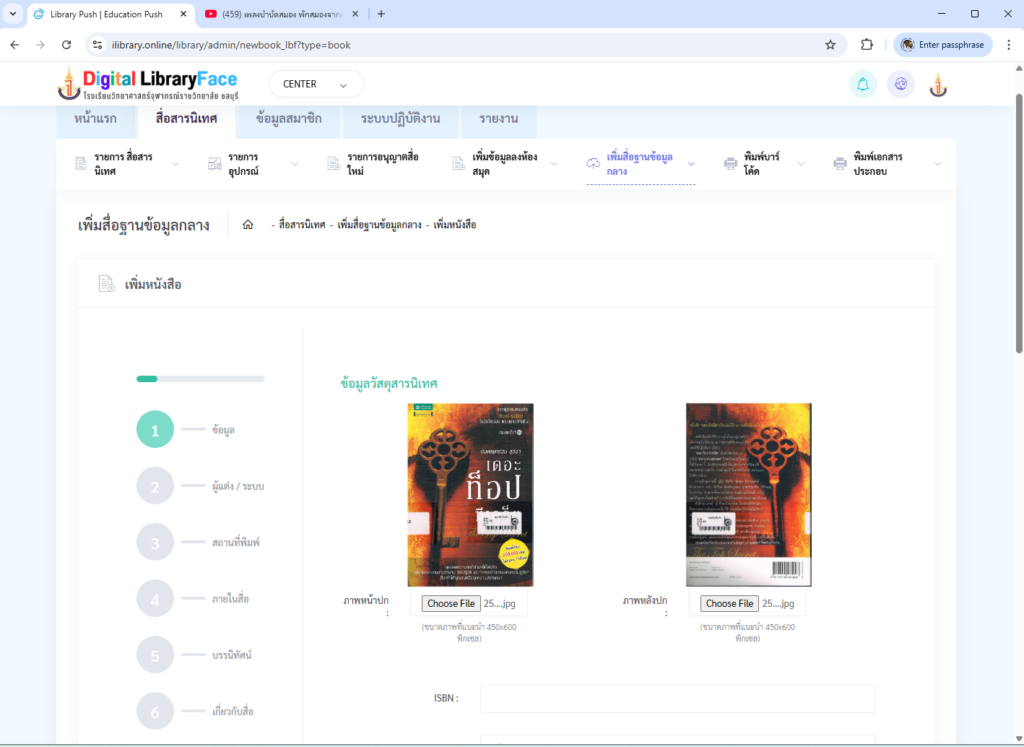 - เลือกเข้าเมนู เพิ่มข้อมูลลงห้องสมุด