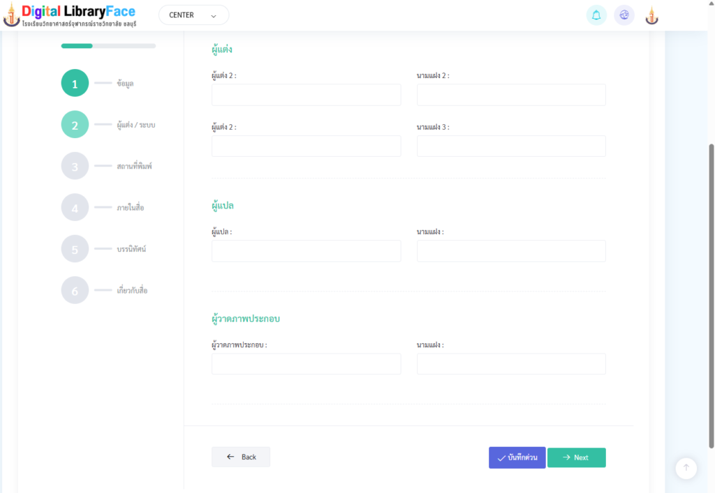- หากต้องการกรอกเท่านี้ให้กดปุ่ม บันทึกด่วน แล้วข้อมูลก็จะถูกเก็บบนฐานข้อมูลกลาง และก็ไปเพิ่มข้อมูลลงห้องสมุดที่เมนู เพิ่มข้อมูลลงห้องสมุด อีกที แต่หากต้องการกรอกให้มากกว่านี้ให้กด >Next กรอกหน้าต่อไป