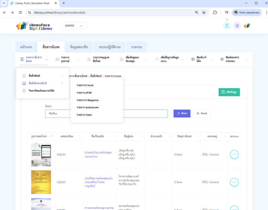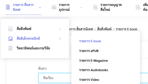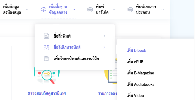 - เลือก สื่ออิเล็กทรอนิกส์ และเลือก เพิ่ม E-Book