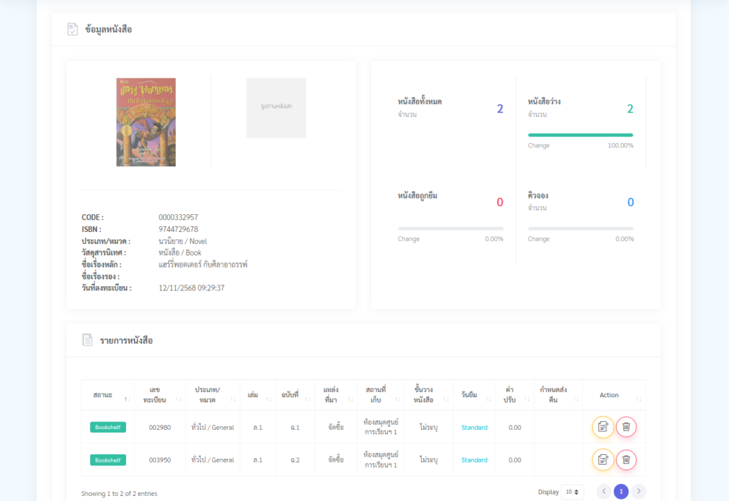 แต่หากมีหลายเล่ม ให้กดเพิ่มแถวที่อยู่ด้านบนเพื่อทำ Copy ระบบก็จะ Run เลขทะเบียน ฉบับที่ให้ - ให้ตรวจสอบเลขทะเบียน และกรอก เลข RFID (ถ้ามี) ให้ถูกต้อง ครบถ้วน แล้วกด บันทึก ก็จะเสร็จสมบูรณ์