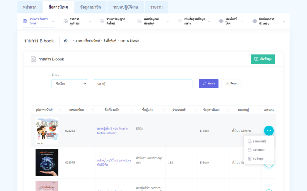 - หากต้องการเข้าถึงข้อมูลในแต่ละเรื่องให้กดตรงชื่อเรื่องตัวสีน้ำเงิน ระบบก็จะเล่นสื่อจะเป็นให้อ่าน E-Book หรือเล่น Video หรือ Audio หรือกดตรงวงกลมสีเขียวจุด 3 จุดที่อยู่ท้ายก็จะมีให้เลือกดู อ่านหนังสือ ตรวจสอบ และลบข้อมูล